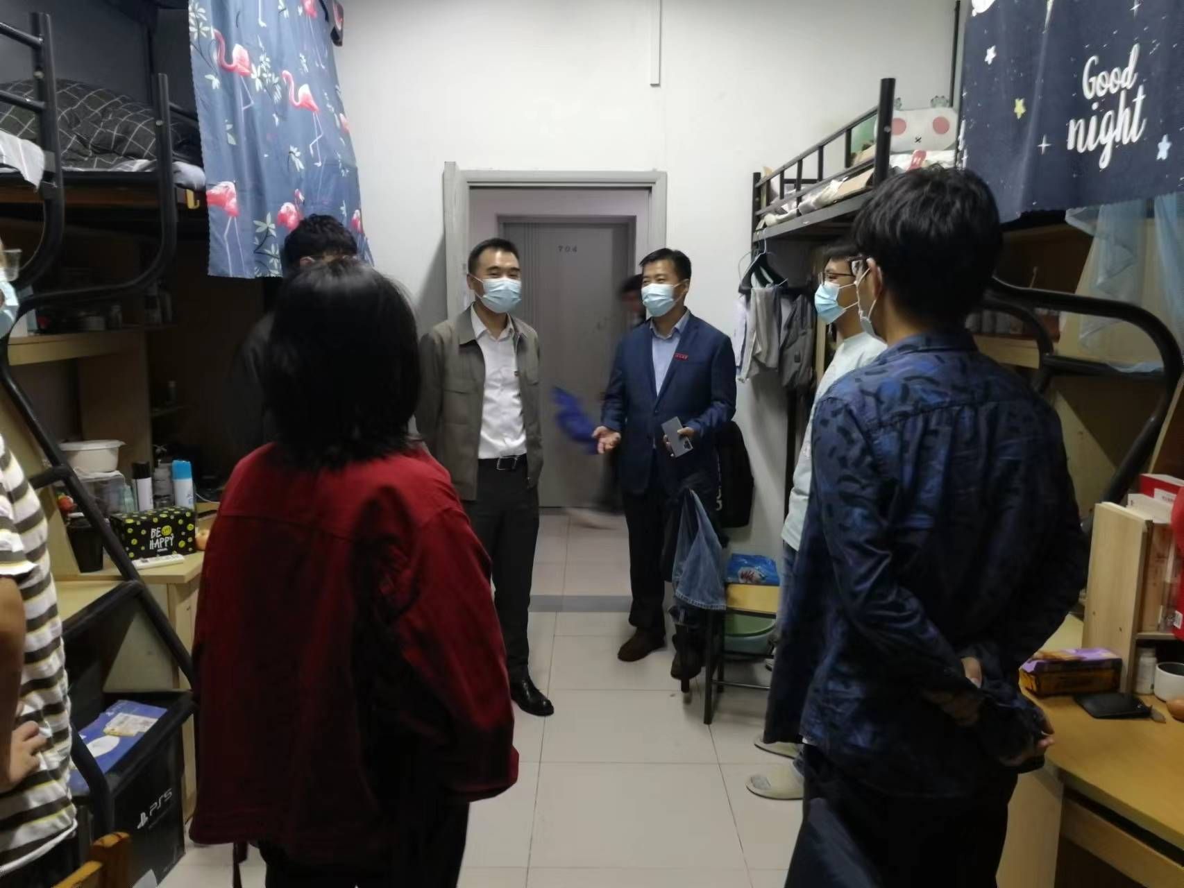 On the evening of October 4, with the joint efforts of teachers and students at the whole school, the university achieved a phased victory in the fight against the pandemic. Prof. Can Kang, secretary of the party committee of the school, Prof. Junfeng Wang, dean of the school, Mr. Jun Zhao, director of party affairs, Mr. Hao Liu, director of administration, and all the counselors went to the student community to visit the students.