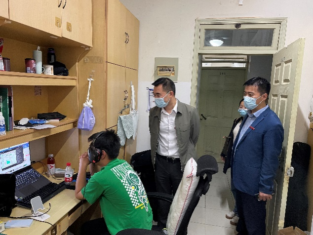 In the student dormitory with key control, the leaders of the school highly affirm everyone's understanding and support for the university’s precaution and control policies and express their concern for the students. In the undergraduate dormitory, the leaders and all the counselors inspect the students' online classes and are very pleased that the students could maintain the same level of participation and enthusiasm offline. At the same time, they learn about the students' diet and rest, physical and mental exercise, recreational activities, etc. through conversation. The leaders express the hope that the students will continue to maintain a positive attitude and continuously striving spirit.
